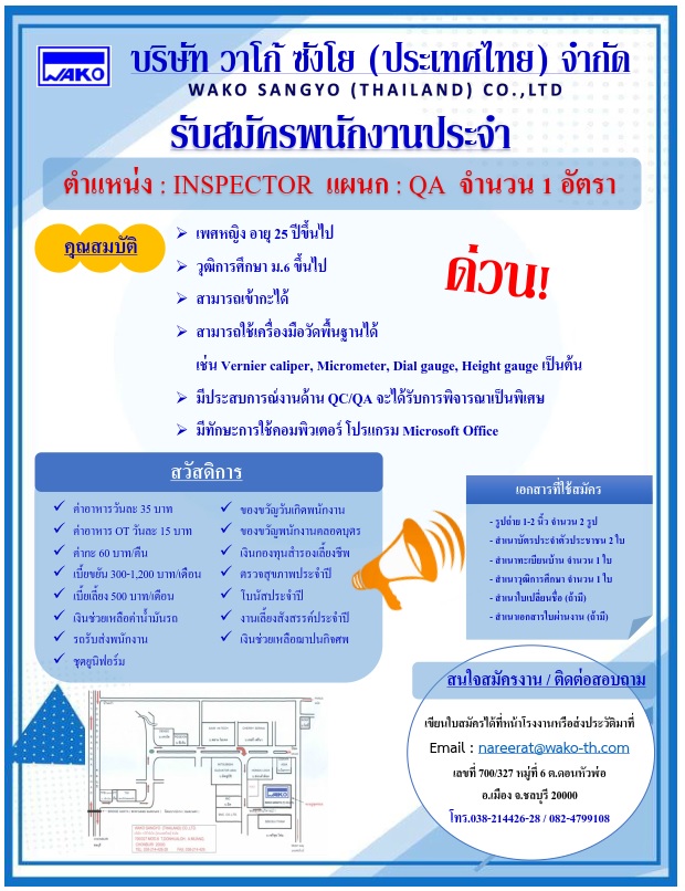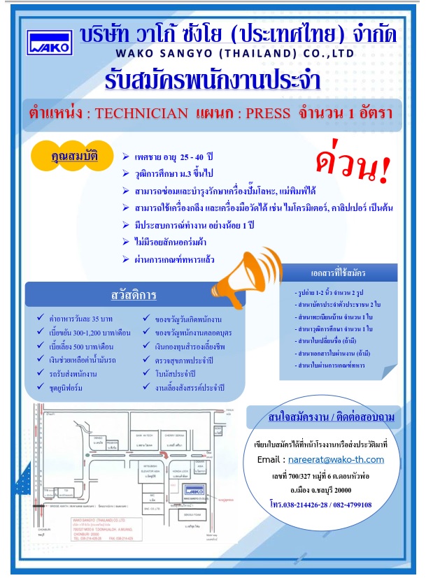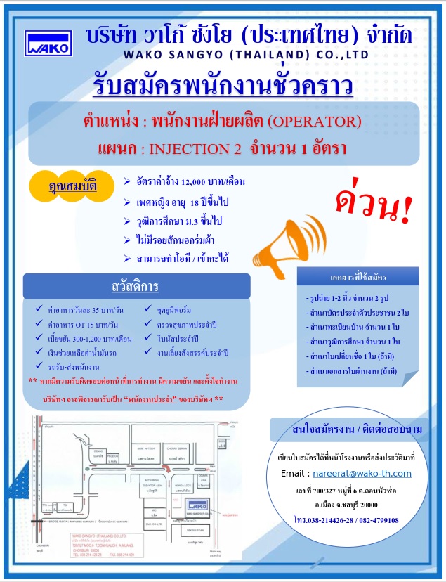บริษัท วาโก้ ซังโย (ประเทศไทย) จำกัด นิคมอุตสาหกรรมอมตะซิตี้ ชลบุรี 700/327 ม.6 ต.ดอนหัวฬ่อ อ.เมือง จ.ชลบุรี 20000 Tel.(038)214426-8 Fax.(038)214429